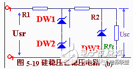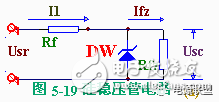 若电网电压升高,整流电路的输出电压Usr也随之升高,引起负载电压Usc升高。由于稳压管DW与负载Rfz并联,Usc只要有根少一点增长,就会使流过稳压管的电流急剧增加,使得I1也增大,限流电阻R1上的电压降增大,从而抵消了Usr的升高,保持负载电压Usc基本不变。反之,若电网电压降低,引起Usr下降,造成Usc也下降,则稳压管中的电流急剧减小,使得I1减小,R1上的压降也减小,从而抵消了Usr的下降,保持负载电压Usc基本不变。