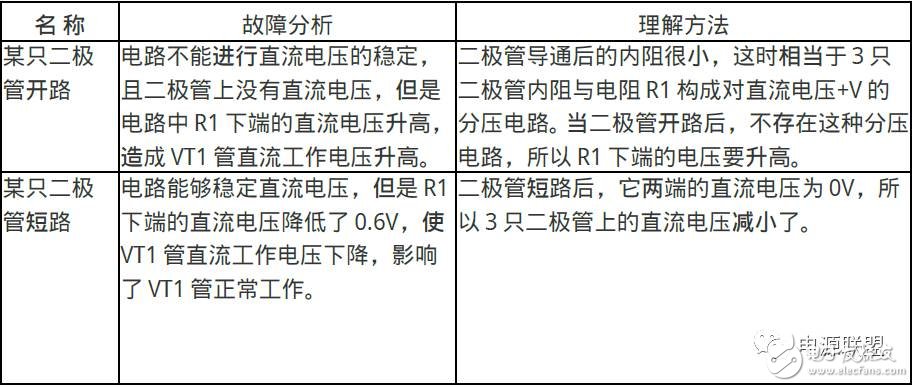 (4)三极管的温度稳定性能不良还表现为温度下降的过程中。在温度降低时,三极管VT1基极电流要减小,这也是温度稳定性能不好的表现。接入二极管VD1后,温度下降时,它的管压降稍有升高,使VT1基极直流工作电压升高,结果VT1基极电流增大,这样也能补偿三极管VT1温度下降时的不稳定。