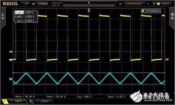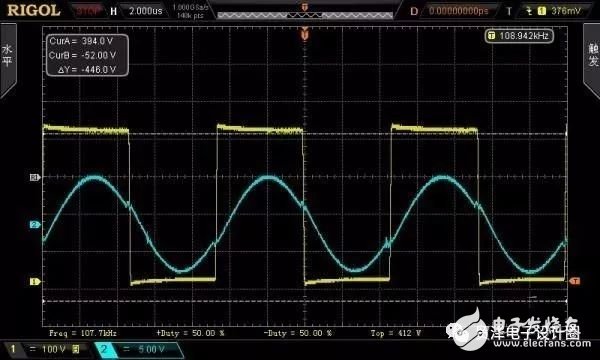 当调整好参数满载时,确实发现:通过减低匝比来降低满载时谐振网络的增益值,确实而有效的提升了开关频率。满载时的开关频率为109K,谐振频率为115K,已经比较接近。观察电流波形,也有比较好的效果。如图5所示。