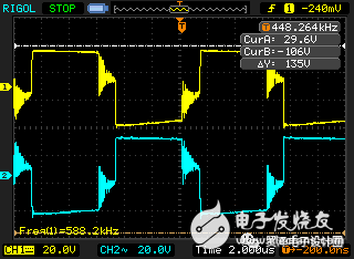 因为工作在低于谐振频率时,也是ZVS状态,而且次级能ZCS。所以也是比较有吸引力。但是初级MOSFET关断电流为励磁电感的最大电流,所以较低的励磁电感会造成MOSFET关闭耗损加大。在第一次的参数中初级励磁电感只有550uH,针对这点重新计算了谐振网络的参数,将励磁电感提高到了850uH,但是问题依然是存在。