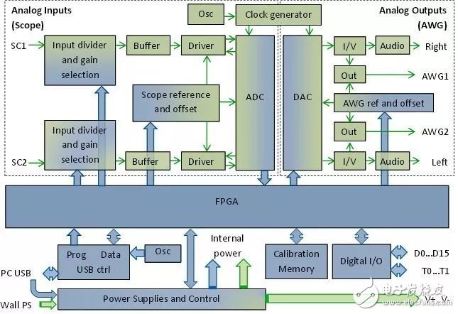 上图是到手的Analog Discovery 2连接使用后的样儿。它具有100MPS双通道USB数字示波器,双通道任意函数发生器,16通道数字逻辑分析仪,信号源、可调电源、频谱分析仪、网络分析仪等十种仪器功能,并且性能参数强劲,足够在校学生与电子设计爱好者日常实验与项目的使用(详情可见:www.digilent.com.cn/products/product-ad2)。所有的这些功能,一定程度上得益于Xilinx Spartan-6 FPGA的高性能和灵活性,配合十分容易上手的 Digilent WaveForms 软件平台(嗯,用了一下确认是完全免费的),充分发挥了该产品所集成的 Xilinx FPGA 和 Analog Devices 各器件的功能。下图为网上所找到的该产品的模块框图: