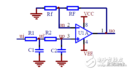 对于二阶压控低通滤波器来说,当通带放大倍数Aup =1(单位增益)时,图所示电路变为图所示,其中RF=R1+R2。