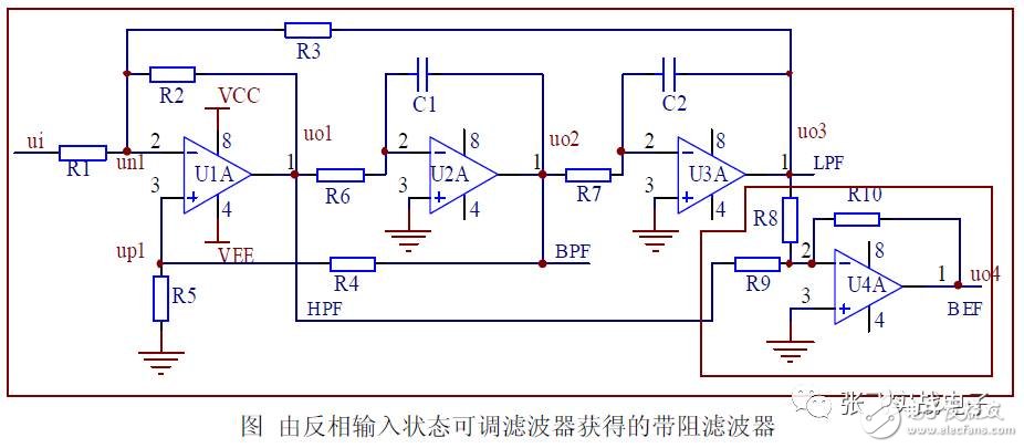 根据带阻滤波器可由低通滤波器和高通滤波器求和获得特征,因此只要将状态可调滤波器的高通滤波输出与低通滤波输出送运放求和(反相和或同相和均可)即可获得带阻滤波器,如图所示。