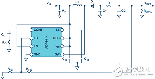 图3. 在输出端添加RC滤波器的ADP161x低输出电流升压转换器设计