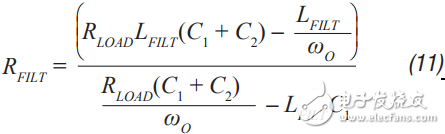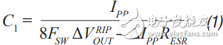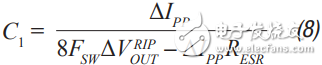 使用RC阻尼网络的LC滤波器设计步骤(图4中的第2种技术)第1步正如之前的拓扑,选择C1,使其等于没有输出滤波器时的情况。10 mV p-p至100 mV p-p是个不错的开始,具体取决于最终目标输出纹波。C1随后可通过公式8计算得出。C1在这个拓扑中可以采用比之前拓扑更小的数值,因为滤波器效率更高。