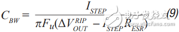 第3步如前所述,添加滤波器会影响转换器补偿,具体表现为降低可实现的交越频率(Fu)。根据公式7的计算,对于电流模式转换而言,可实现的最大Fu是开关频率的1/10以下,或者是滤波器FRES的1/5以下。幸运的是,大部分模拟负载不需要太高的瞬态响应。公式9计算转换器输出所需的输出电容近似值(CBW),以提供指定的瞬态电流阶跃。