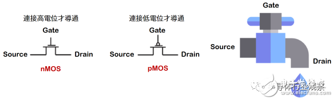 MOS 晶体管对外有三个连接:源极(Source)、汲极(Drain) 与闸极(Gate)。只看这个符号可能会觉得非常抽象,让我们举个简单的例子: