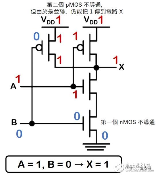 同理,A 连接的 pMOS Gate 不会导通、nMOS 继续导通将0 传给电路X,最后输出即为0。
