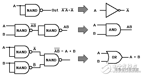 用一个NAND 逻辑门,就能做出NOT、AND、OR 等逻辑门