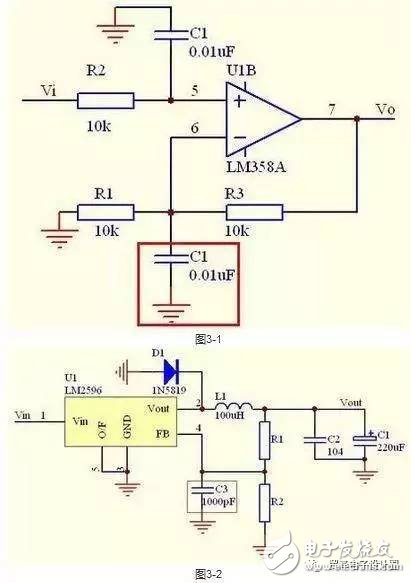 正确的去耦电容应该要组成RC电路,就是在运放的输出端先串入一个电阻,然后再并接去耦电容(如图2-2)。这样做可以大大削减运放输出瞬间电流,也不会影响环路的相位特性,可以避免振荡。
