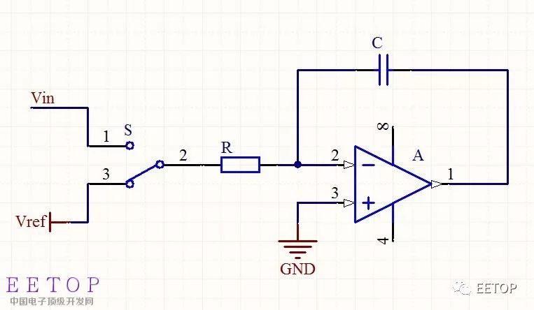 顾名思义,积分ADC的基本原理就是利用运放对输入信号和参考信号进行积分输出,这里参考信号一般与输入信号极性相反,这样输出电压就会有上升时间和下降时间,根据计数器来统计时间,最后按照函数关系得到采样信号的值。