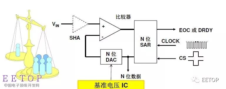 顾名思义是利用比较的方式来转换输出数字量,这个用来比较的值由DAC产生,如下图:初始化DAC的输出由寄存器设置为1/2Vref,然后由比较器判断大小来决定输出1或0,进而进行下一步再次设置寄存器输出DAC,如此循环到最后一次LSB。依次输出的0和1即为转换后的数字量。算法核心就是二分法搜索,类似于猜数字值的游戏。