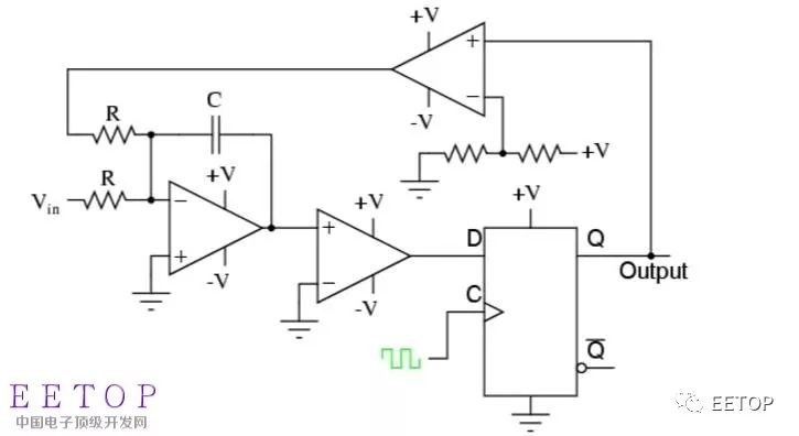 +V反馈到第一个运放输入,驱动积分器向反方向输出,待采集信号Vi也会驱动积分器输出,综合而言如果积分器输出为0,第二个比较器反馈回来的就是-V,以驱动积分器向输出。这个环路最后的目的是实现运放的基本特性:反相端应该为0!