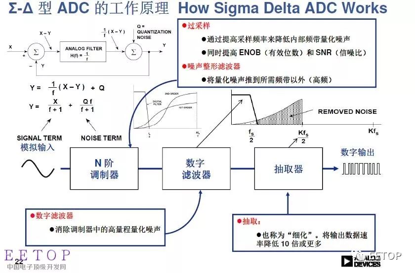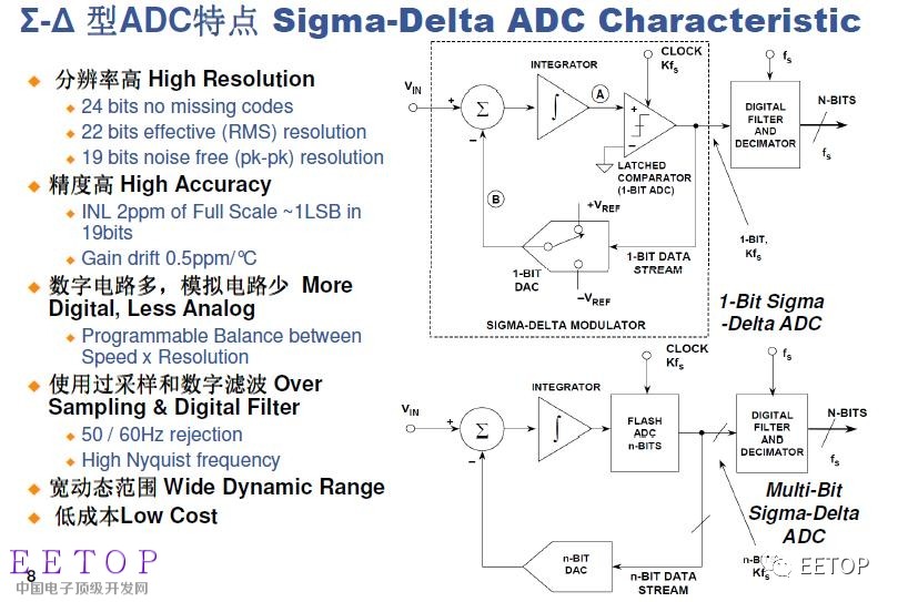Sigma-Delta 型ADC也是目前应用相当多的一种ADC架构,尤其是在高位数分辨率的ADC设计上,这种调制型的ADC转换设计尽可能采用数字电路来处理并结合算法实现更好的性能。核心技术点:过采样和噪声整形。