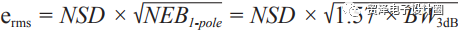 噪声等效带宽(NEB)对噪声计算是一个很有用的简化。由于截止频率以上的增益不是0,某些超出电路带宽的噪声会进入电路中。NEB是计算的理想砖墙滤波器的截止频率,它会放入与实际电路相同的噪声量。NEB大于–3 dB带宽,已针对常用滤波器类型和阶数进行计算,例如:对于单极点低通滤波器,它是–3dB带宽的1.57倍,写成公式就是NEB1-pole = 1.57 × BW3dB。然而,关于应把该乘法因数放在噪声公式中的何处,似乎一直存在混淆。请记住,NEB调节的是带宽,而非噪声,因此应在根号下面,如下式所示: