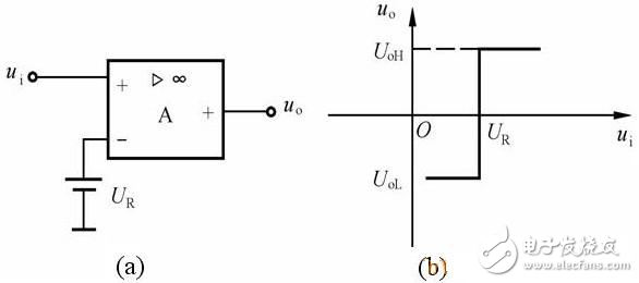 电压比较器是将一个模拟输入信号ui与一个固定的参考电压UR进行比较和鉴别的电路。