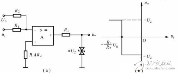 将零电平比较器中的接地端改接为一个参考电压UR(设为直流电压),由于UR的大小和极性均可调整,电路成为任意电平比较器或称俘零比较器。