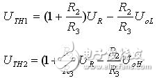 利用求阈值的临界条件和叠加原理方法,不难计算出图4(b)所示的同相滞回比较器的两个阈值
