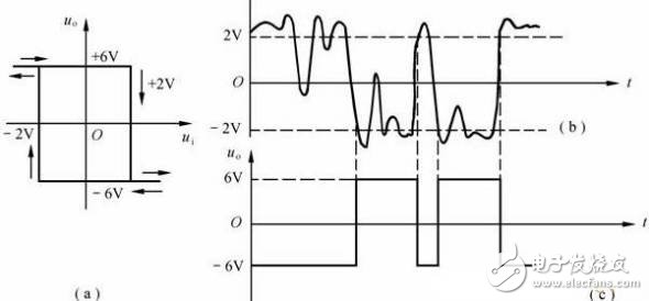 例如,滞回比较器的传输特性和输入电压的波形如图6(a)、(b)所示。根据传输特性和两个阈值(UTH1=2V, UTH2=–2V),可画出输出电压uo的波形,如图6(c)所示。从图(c)可见,ui在UTH1与UTH2之间变化,不会引起uo的跳变。但回差也导致了输出电压的滞后现象,使电平鉴别产生误差。