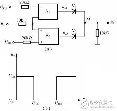 双限比较器又称窗口比较器。它的特点是输入信号单方向变化(例如ui 从足够低单调升高到足够高),可使输出电压uo跳变两次,其传输特性如图7(b)所示,它形似窗口,称为窗口比较器。窗口比较器提供了两个阈值和两种输出稳定状态可用来判断ui 是否在某两个电平之间。