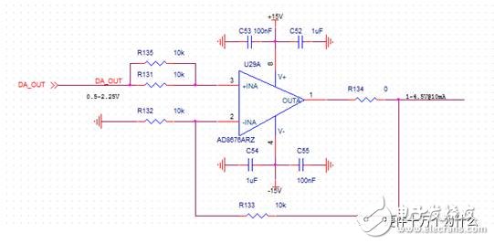 采集4-20mA电流,得到1V-5V电压差,放大2倍后进入后级ADC。为了防止电阻功耗过高,R128,R129,R130三个电阻采用了并联取值的方式,最终取到了250Ω这个值。