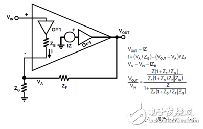 它与VFA区别是,输入端不再是两个都虚断,反相输入电阻ZB是个非常小的值,但又绝对不能认为是零;它的开环增益Gout不再是非常大,而是约等于1;它的跨阻Z可以认为是无穷大。