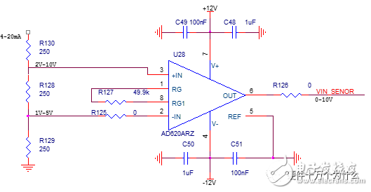 再看原理图,在20mA的时候,Vin+达到了10V,Vin-是5V,放大2倍,在仪放内部需要将Vin+放大到12.5V。这已经超过了仪放供电电压,因此,是绝对不可能正常工作的。
