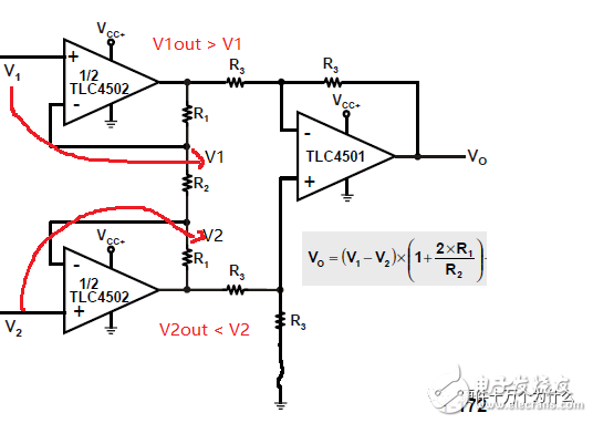 正相输入电压和反相输入电压体现在仪放内部的R2处,而真正进行输出的电压,是由V1out和V2out体现的,换一句话说,最终增加的电压值平分为两份,一份由V1out提供,它会比V1高,另外一份由V2out提供,它会比V2低。