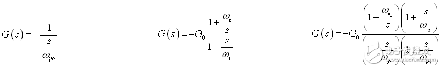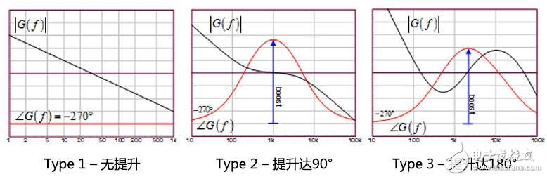 有不同类型的补偿器,其在开关转换器中通常命名为 type 1 、type 2 和 type 3 。所有三个型号在原点都有一个极点以提供最大可用准静态增益(S = 0),提供一个精确的输出变量。type-1 补偿器是个简单的积分电路,完全不提供相位提升。type 2 基于 type 1,和增加了一个极 / 零对以提供最大90°的相位提升。最后,type-3 电路提供另一个极零对,可提升相位达180°。图1显示了三种补偿器的频率响应(幅度和相位)及各自的传递函数表达式。更多关于这些电路的信息请查阅[ 1 ]。