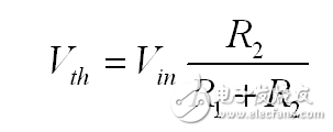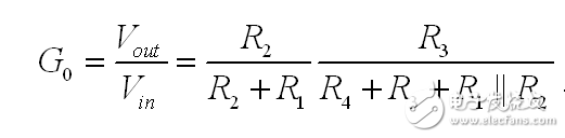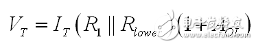 输出电阻 Rth 是 R1 与 R2 并联的值。因此完整的传递函数涉及到与 Rth 串联的 R4 和加载的 R3 所构成的电阻分压器。rC 是断开的,由于电容 C1 在这直流分析中被移除。因此可写: