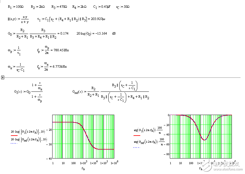 不只您可能在推导表达式时犯错误--我也会!但是将结果格式化到像(9)这样需要更多的精力。此外,请注意,在写(9)时我们没有写一行代数。如果我们后来发现一个错误,那么易于回到一个单独的图纸并单独修复它。(9)的校正将是容易的。现在尝试在(10)进行相同的修正,您可能会从头开始。您检查一下,在 Mathcad® 表绘制的表达式(9)和(10)的频率响应是相同的,如图7所示。