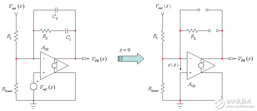 图2:在该补偿器中,我们考虑运放具有有限开环增益,但我们尚不考虑其内部极点。