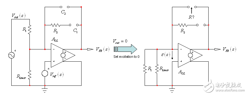 按照求解图3电路的途径,我们可研究 s= 0 的系统,如图8所示。在分析的过程中,Vref 是个完美的源及其动态响应为0(忽略我们应用的调制,它的电压是固定的)。因此,它自然不存在于小信号电路,在交流分析中采用短路的形式。