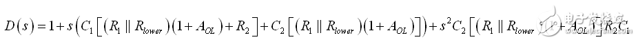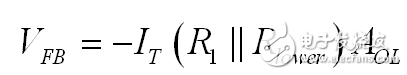 Type-2 补偿器常见于电流模式电源,其最大相位提升90°,可提供大量补偿。图2所示为它用于运算放大器周围。您可观察一个检测所监测变量(Vout,本例子中为输出电压)的电阻分压器和几个形成滤波器的无源元件。为确定该转换器的传递函数,我们将首先考虑运放的开环增益 AOL ,并看看它如何影响最终的表达式。该电路的传递函数 G 是联系励磁信号 Vout 到输出响应 VFB 的数学关系。