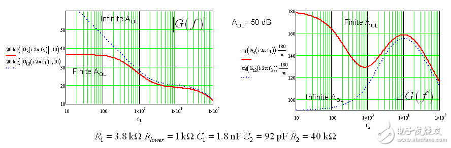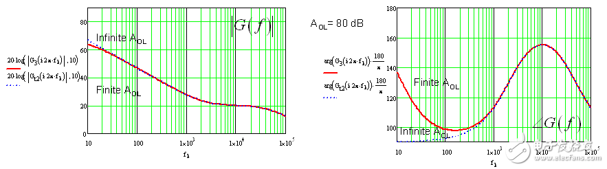 图15:当开环增益AOL增加,两条曲线很好地叠加。准静态增益提高到66.3 dB,对比于采用50dB AOL增益时的36 dB 。
