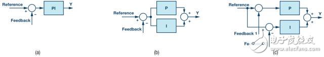 举个例子,考虑图1 (a)所示的常规比例积分控制器(PI)。 P部分和 I 部分采用相同的反馈信号工作,意味着该信号的动态特性必须适合两种控制路径。不过,P路径和I路径可以分离,如图1 (b)所示。由此还可以再前进一小步,图1 (c)显示P路径和I路径分离,并且采用具有不同动态特性的反馈信号工作。