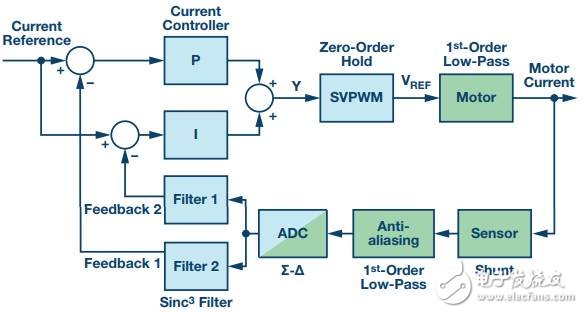 电机相电流由一个传感器(分流电阻)测量,并流经一个抗混叠滤波器,供应给Σ-Δ ADC。然后,1位数据流输入两个sinc滤波器,一个针对P控制器调谐,另一个针对I控制器调谐。