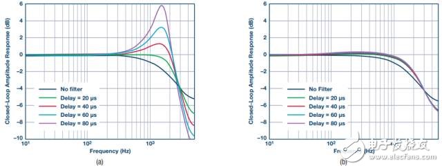 作为对比,图3(a)显示了反馈路径(无双反馈)中仅使用一个sinc滤波器时的闭环幅度响应。开关频率fsw为10 kHz,奈奎斯特频率设置为5 kHz。在这些系统参数下,对于0 μs至80 μs的sinc滤波器群延迟,绘制闭环响应曲线。注意,群延迟与抽取率直接相关。同预期一样,低抽取率和群延迟对闭环稳定性的影响很小,但随着延迟增加,系统阻尼变得越来越小。
