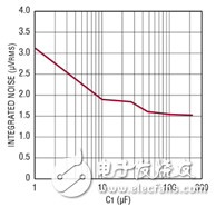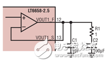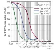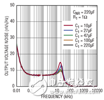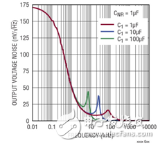 通过增大输出电容器,噪声可以进一步降低。当 NR 和输出电容器都增大时,输出噪声就可以降至几微伏。使用1μF 至 50μF的输出电容器,LT6658 是稳定的。如果并联放置一个1μF的陶瓷电容器,那么输出用较大的电容也可以稳定。例如,图 3b 显示了一个1μF陶瓷电容器与一个100μF聚合铝电容器并联的电路。这种配置在降低噪声带宽时仍然保持稳定。图 3c 说明了不同输出电容值时的噪声响应。在所有这 3 种情况下,都有一个小型1μF陶瓷电容器与一个较大的电容器并联。