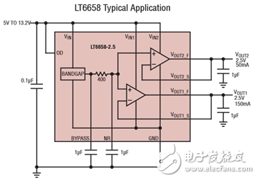 很多时候在设计过程中,需要在精确度和功率之间做出抉择。如果采用比较 “暴力” 的方法,就在需要高精确度时使用电压基准,需要毫瓦级功率时使用稳压器。这样做除了增加所需电路板空间和成本,还必须通过特定路径单独传送信号,即使这些信号的标称电压相同。而且,如果需要一个高精确度电压源提供毫瓦级功率,那么设计师就必须对基准进行缓冲。LT6658 提供两个低噪声、高精确度输出,总共提供 200mA 输出电流,还提供世界级的基准规格,从而解除了这个困境。