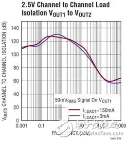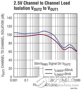 隔离良好的输出缓冲器抑制来自相邻缓冲器的负载瞬态,对相邻输出产生最小影响。图 2a 和 2b 说明了通道至通道输出隔离。一个输出在50mVRMS上摆动,所画曲线表示相邻缓冲器中的变化。