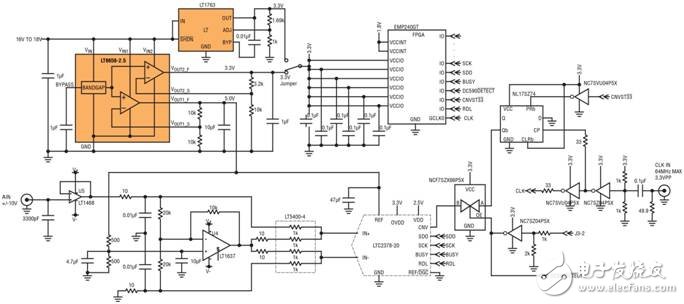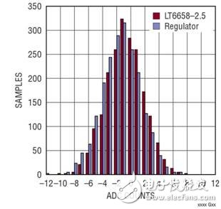在本应用中,LT6658 或一个单独的稳压器电源为在一个通道上驱动一个有噪声 FPGA 电源 (VCCIO) 和某种混杂逻辑的 3.3V 电源轨供电,并向另一个通道上的 20 位 ADC 之基准输入提供 5V 电源。通过在 LT6658 和稳压器之间切换数字电源,我们可对 LT6658 把一个通道上的数字噪声与驱动 20 位 ADC 之安静基准输入的通道相隔离所能达到的水平进行评估。如图 5b 所示,在 ADC 的输入端上使用一个干净的 DC 电源即可推断噪声。无论是由LT6658 还是由稳压器电源给FPGA 的 VCCIO 引脚供电,直方图并无明显的不同,这展示了 LT6658 坚固的稳压和隔离性能。