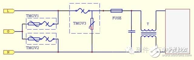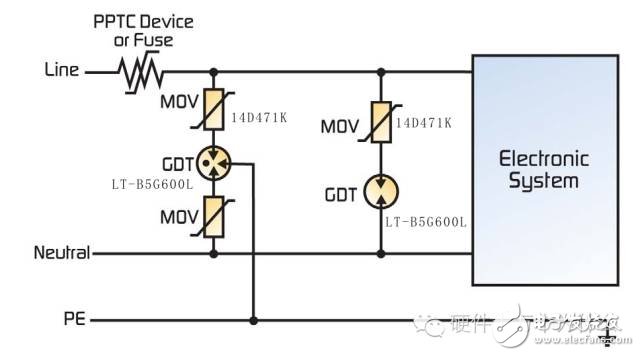 由于压敏电阻(MOV)具有较大的寄生电容,用在交流电源系统,会产生可观的泄漏电流,性能较差的压敏电阻使用一段时间后,因泄漏电流变大可能会发热自爆。为解决这一问题在压敏电阻之间串入气体放电管。如上图中,将压敏电阻与气体放电管串联,由于气体放电管寄生电容很小,可使串联支路的总电容减至几个pF。在这个支路中,气体放电管将起一个开关作用,没有暂态电压时,它能将压敏电阻与系统隔开,使压敏电阻几乎无泄漏电流。但这又带来了缺点就是反应时间为各器件的反应时间之和。例如压敏电阻的反应时间为25ns,气体放电管的反应时间为100ns,则R2、G、R3的反应时间为150ns,为改善反应时间加入R1压敏电阻,这样可使反应时间为25ns。