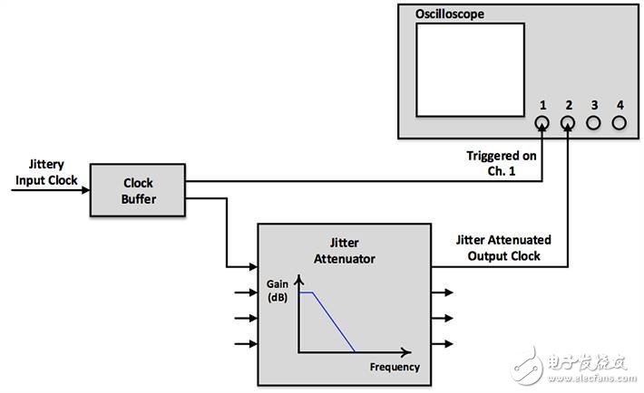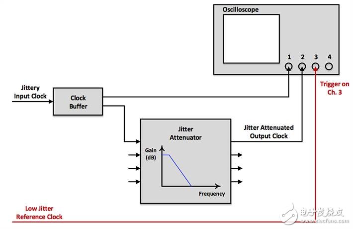 第三方仲裁如果你有一个范围,那么同时比较抖动输入和抖动衰减输出时钟的更好方法是什么?找到仲裁的第三方。换句话说,找到或生成与抖动参考时钟相关的整数,并且与输入和输出时钟同步。然后使用其作为输入和输出时钟的触发的参考。请参见下图中修订的测试设置图。现在,您可以在时域中同时明确比较输入和输出时钟的抖动。
