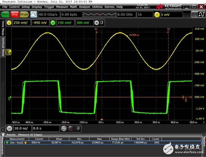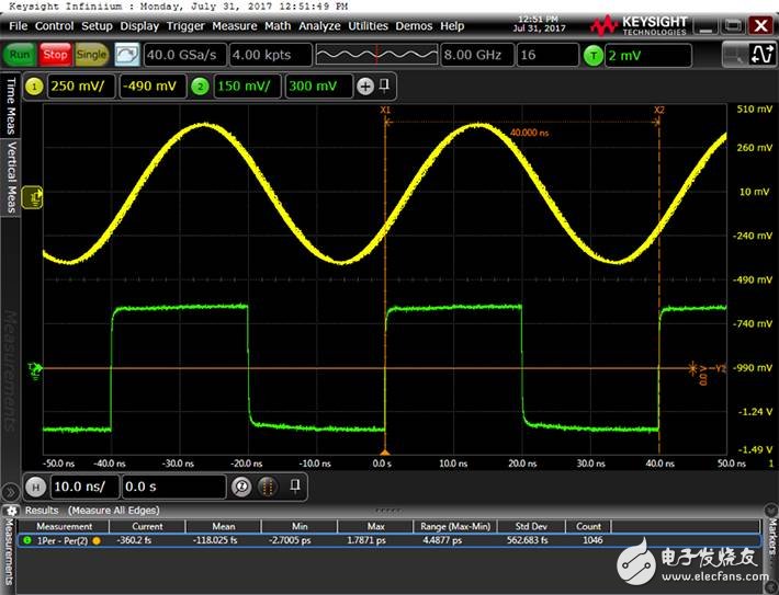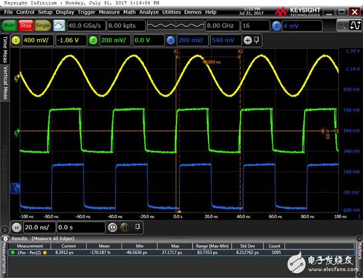 请注意,如果您在输出时钟上触发,那么输入时钟将看起来抖动很大。见下文。哪个时钟出现抖动只是一个触发视角的问题。在不知道哪个时钟更加不稳定的前提下,这种特定的范围测量并不是决定性的。