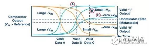 在一组比较器中,当比较器基准电压精确等于或极其接近待比较的电压时,便可能发生亚稳态状况。比较电压在幅度上越接近基准电压,比较器作出全面判断所需的时间就越长。如果二者之间的电压差非常小或为0,比较器可能没有足够的时间来最终判定比较电压是高于还是低于基准电压。当该样本的转换完成时,比较器输出可能处于亚稳第三态,而不是清晰地判定一个有效逻辑输出1或0。这种犹豫不定会波及整个ADC,可能引起转换错误。