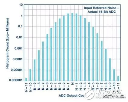 折合到输入端的噪声是ADC转换缺陷的一个固有分量,其中包括ADC输入端的热噪声。常常利用ADC输入端开路或浮空情况下的数字输出码直方图来对其进行量化。ADC数据手册通常会说明并显示此噪声。下面的图形给出了此噪声幅度的例子,其在本例中为[N] ±11。