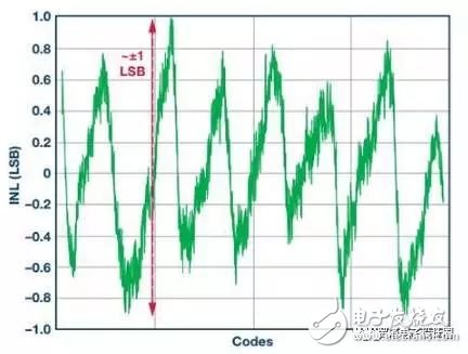 图4. INL曲线示例,在所有ADC编码上测量,与理想样本相比,最大误差为±1 LSB或±1个码,对ADC转换误差而言基本上可忽略不计。