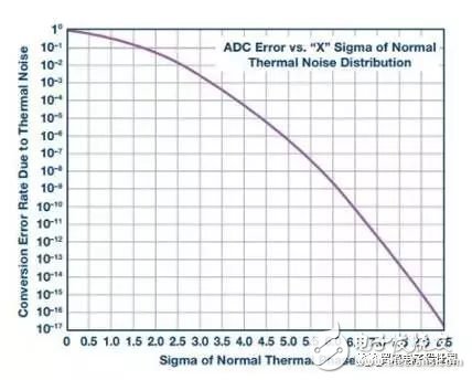 图5. ADC转换误差率与其热噪声的关系通常只能通过晶体管级电路仿真获得。上图为一个12位ADC的示例图,要实现10-15的CER,其必须能承受8 Σ的热噪声。