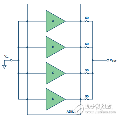 这种方法的缺点是偏置电流、电流噪声和输入电容提高,但在本例中,这些效应可忽略不计。在输出之间放置一个50 Ω之类的小电阻,可防止各输出之间的细微差异引起的额外电流流动。对于对功耗不太敏感的应用,可以省去这些50 Ω电阻以提高可用输出电流。图1所示电路是缓冲放大器的一种新型配置,能将电压噪声减半。